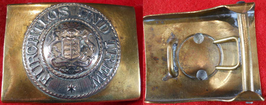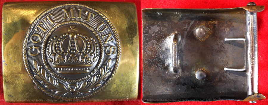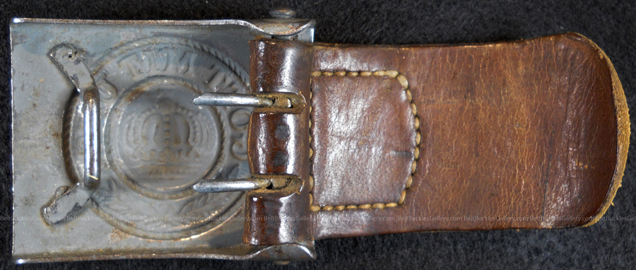 Materiál: mosaz a niklovaný motiv Konstrukce: dvoudílná, korpus s prostřihem pro hák opasku, čelní motiv letovaný na dva body, mosazná osička s trny Varianty provedení motivu koruny Období: po roce 1895 Material: Brass and nickeled inset Construction: two piece with two point solder attachment, punched out center catch, brass roller and thorns. Note: crown variation After 1895 |