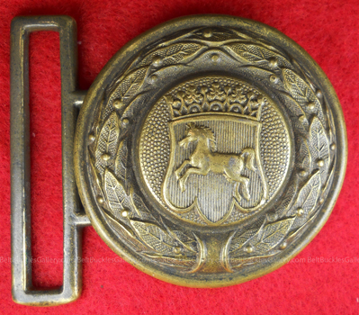 Materiál: železo Konstrukce: dvoudílná, provedení úzké přezky Zemská policejní přezka po r. 1953 |